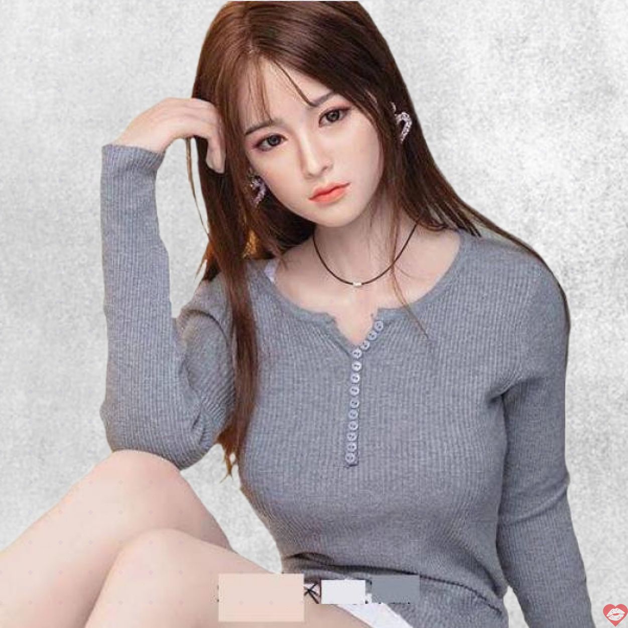 Làn da trắng mịn màng như lụa được chế tác từ silicone bạch kim cao cấp, mềm mại và mát lạnh như da người thật. Mái tóc socola dài sóng nhẹ tạo nên nét dịu dàng, đầy mê hoặc khiến bạn không thể rời mắt.