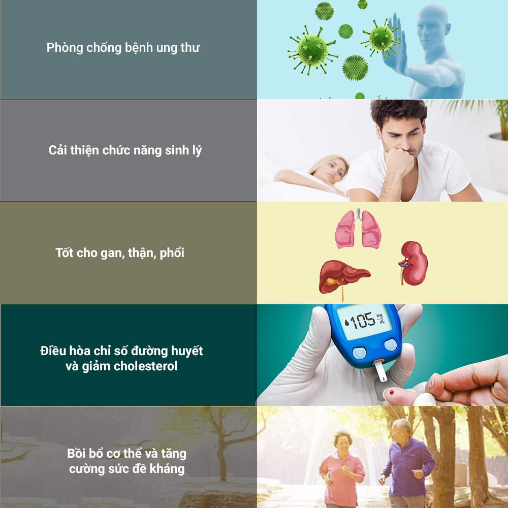 • Tác dụng chính: Cải thiện sinh lý, tăng sức đề kháng, điều hòa đường huyết và cholesterol, hỗ trợ gan thận phổi.